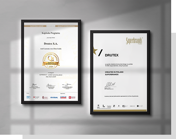 „DRUTEX“ visada siekė klientams tiekti aukštos kokybės produktus. 1999 metais įmonei buvo suteikti Miuncheno „TÜV Management Service“ GmbH tarptautiniai sertifikatai ISO 9001 ir ISO 14001, kurie patvirtina, kad mūsų įmonėje yra įdiegti ir taikomi kokybės vadybos principai, o pati įmonė atitinka aplinkosaugos vadybos sistemos standarto reikalavimus.