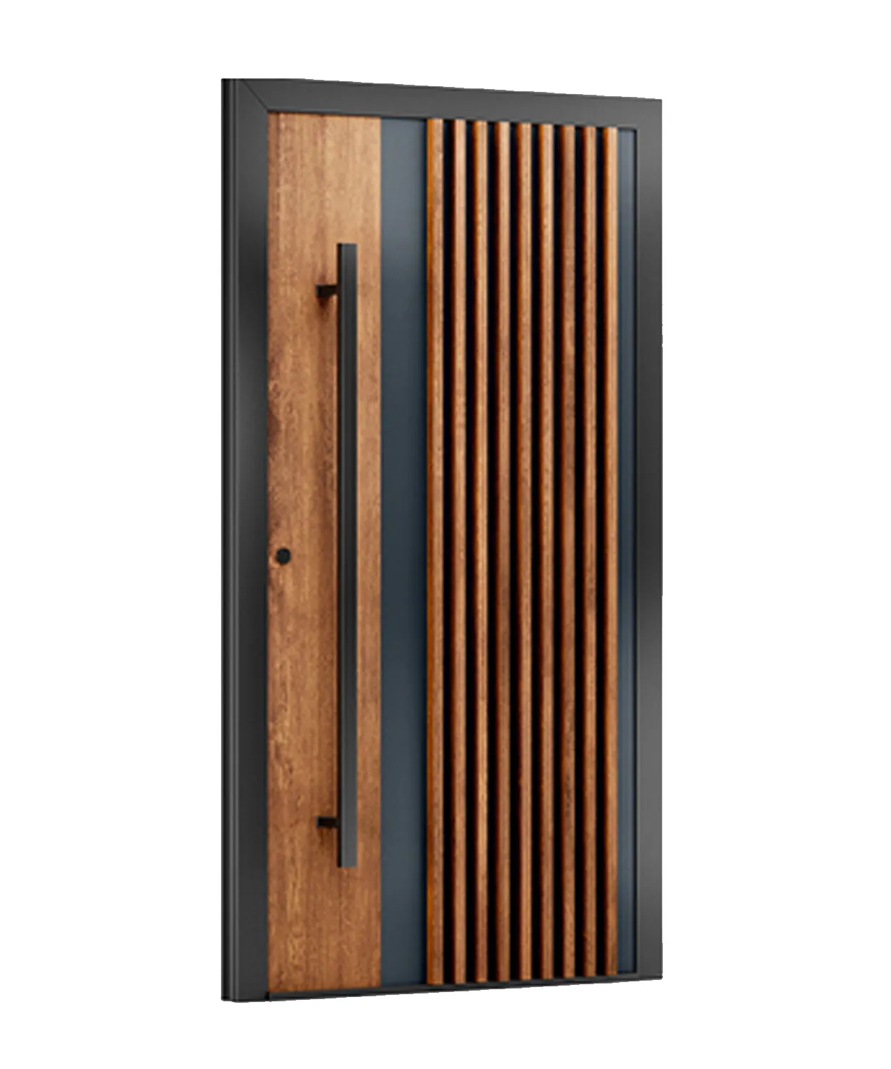 A pivot door for external installation, whose main features are its large dimensions and unusual design. The offset pivot axis gives them a unique appearance and the concealed hinges are characterised by a very high load capacity.