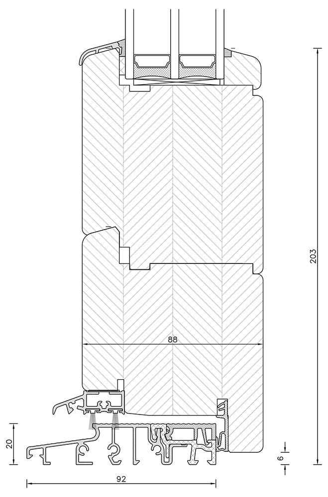 Medinės durys pagamintos iš aukščiausios kokybės trijų sluoksnių klijuotos medienos, 68 mm storio, kuri yra klasikinio dizaino, didelio durų patvarumo ir stabilumo bei aukščiausios kokybės apdirbimo pagrindas. Medinės „Drutex“ išorinės durys – tai ne tik elegantiškas dizainas ir įmantri išvaizda, bet ir puiki izoliacija. Standartinėje versijoje duryse sumontuotas aliuminio slenkstis su terminiu tarpikliu, kuris teigiamai veikia visos sistemos šilumos izoliacijos parametrą.